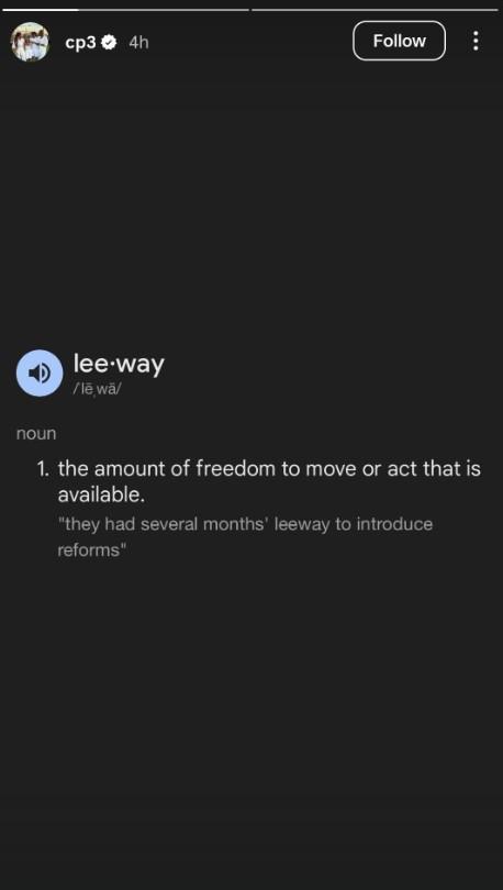 值得一提的是,快船跟队记者Law Murray在事后晒出了保罗的社媒截图,在快船这波低迷表现期间,保罗曾以单词“Leeway”作为社媒内容,暗示球队缺少问责机制。